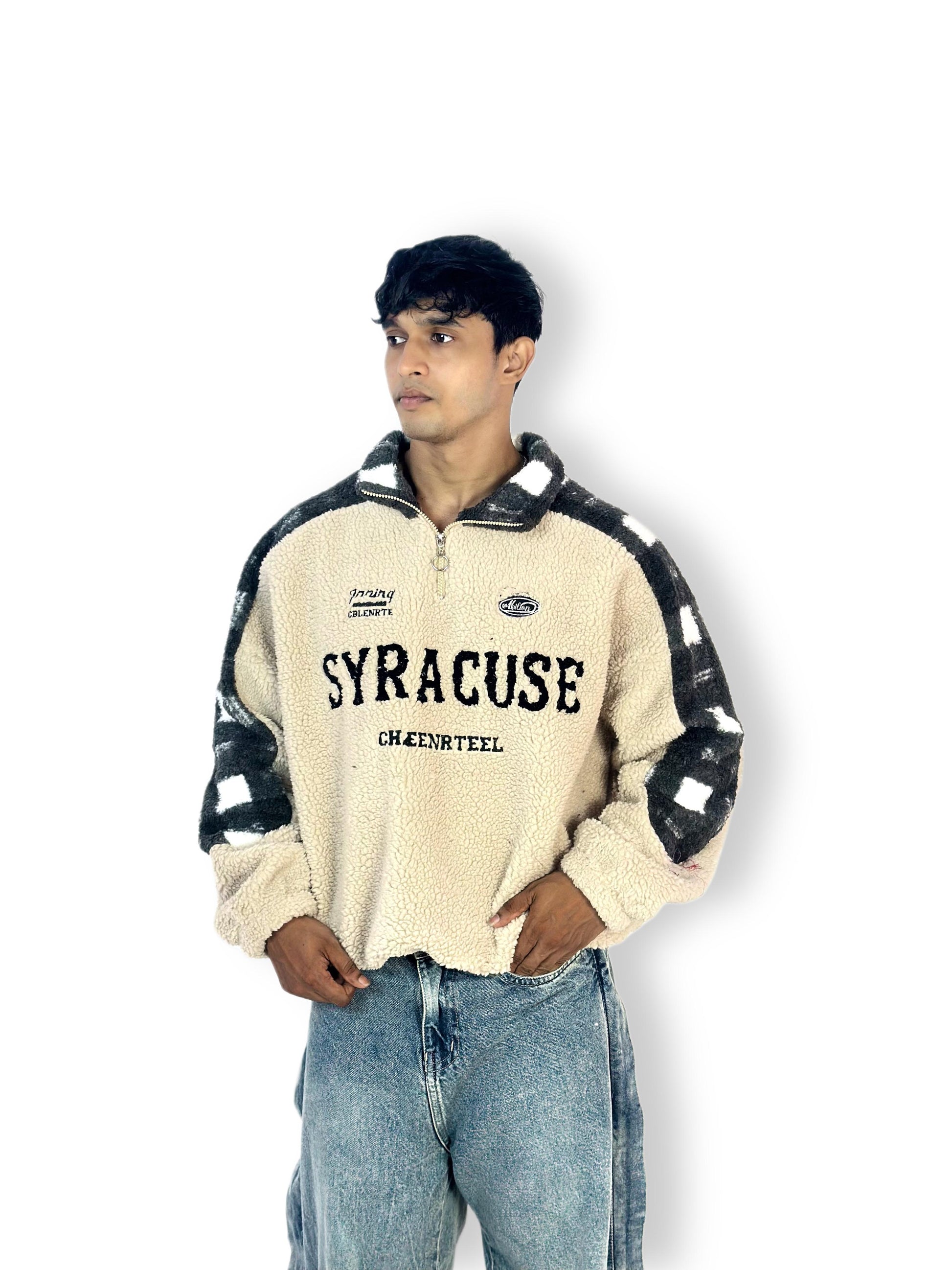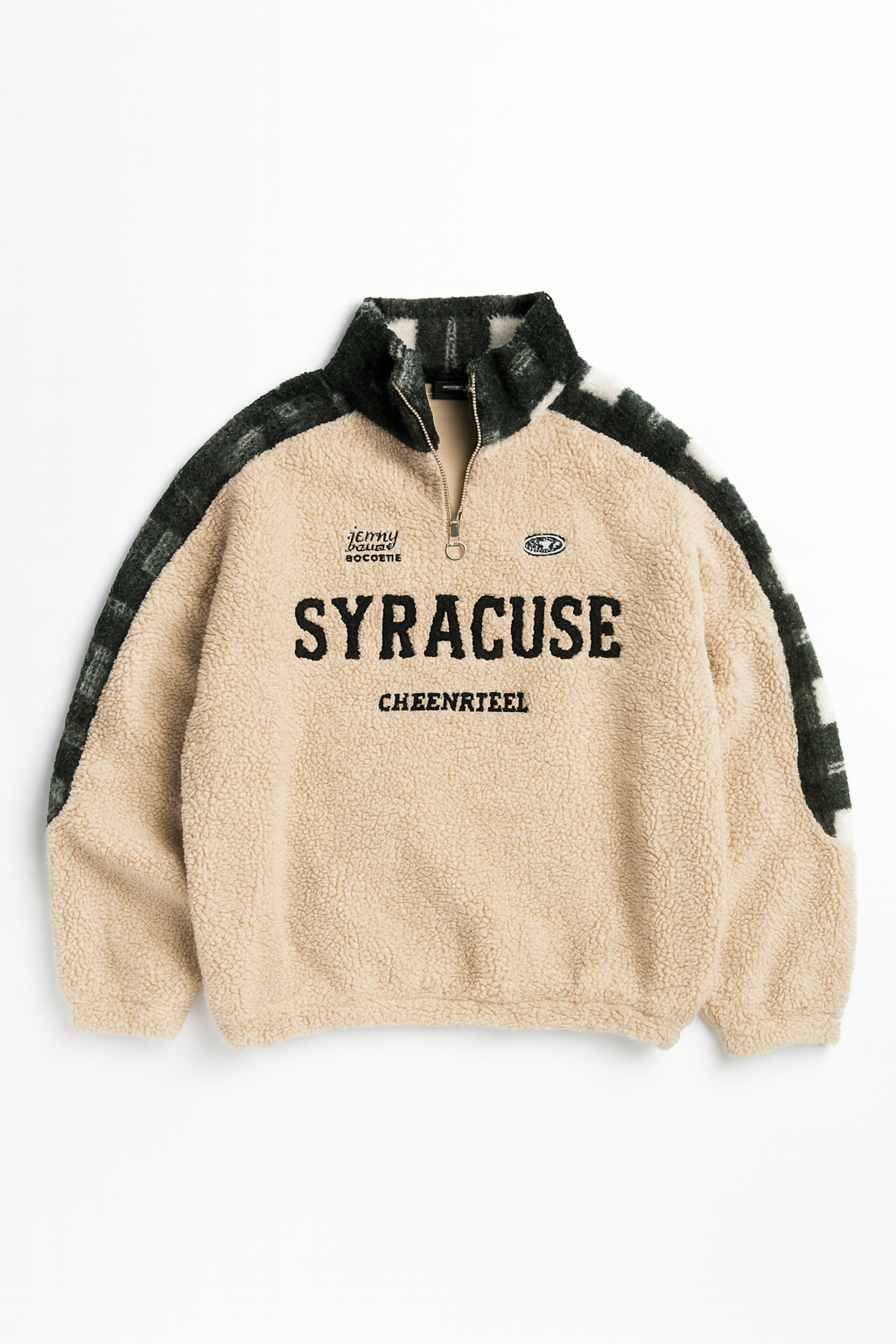 Stay cozy and stylish with this Beige & Black Syracuse Sherpa Sweatshirt, designed for ultimate comfort and casual wear. Made with ultra-soft fleece fabric, it features a half-zip front, bold "SYRACUSE" text across the chest, and contrasting black sleeves with white checkered patterns for a trendy streetwear vibe. Perfect for chilly days, lounging, or outdoor wear.