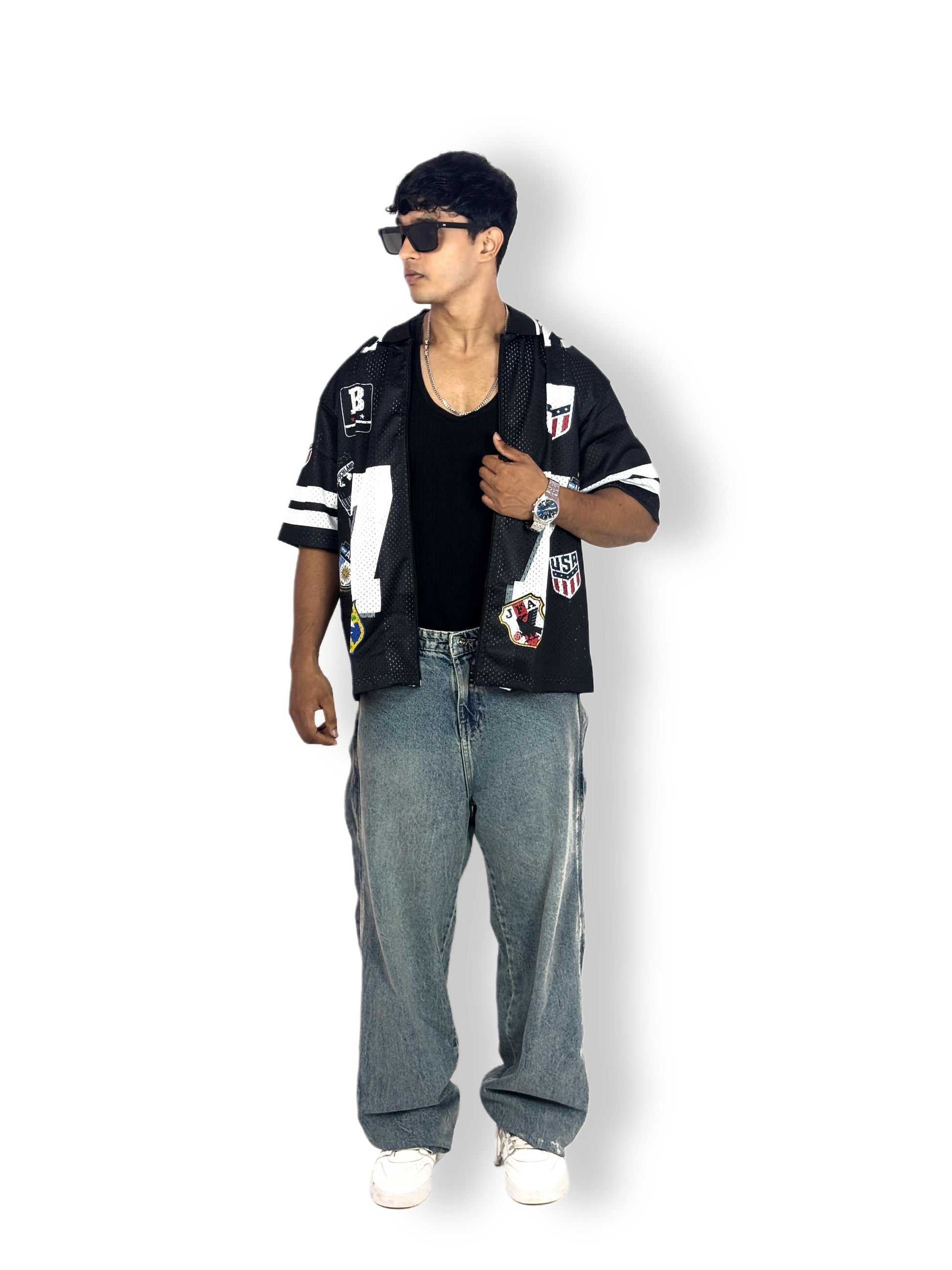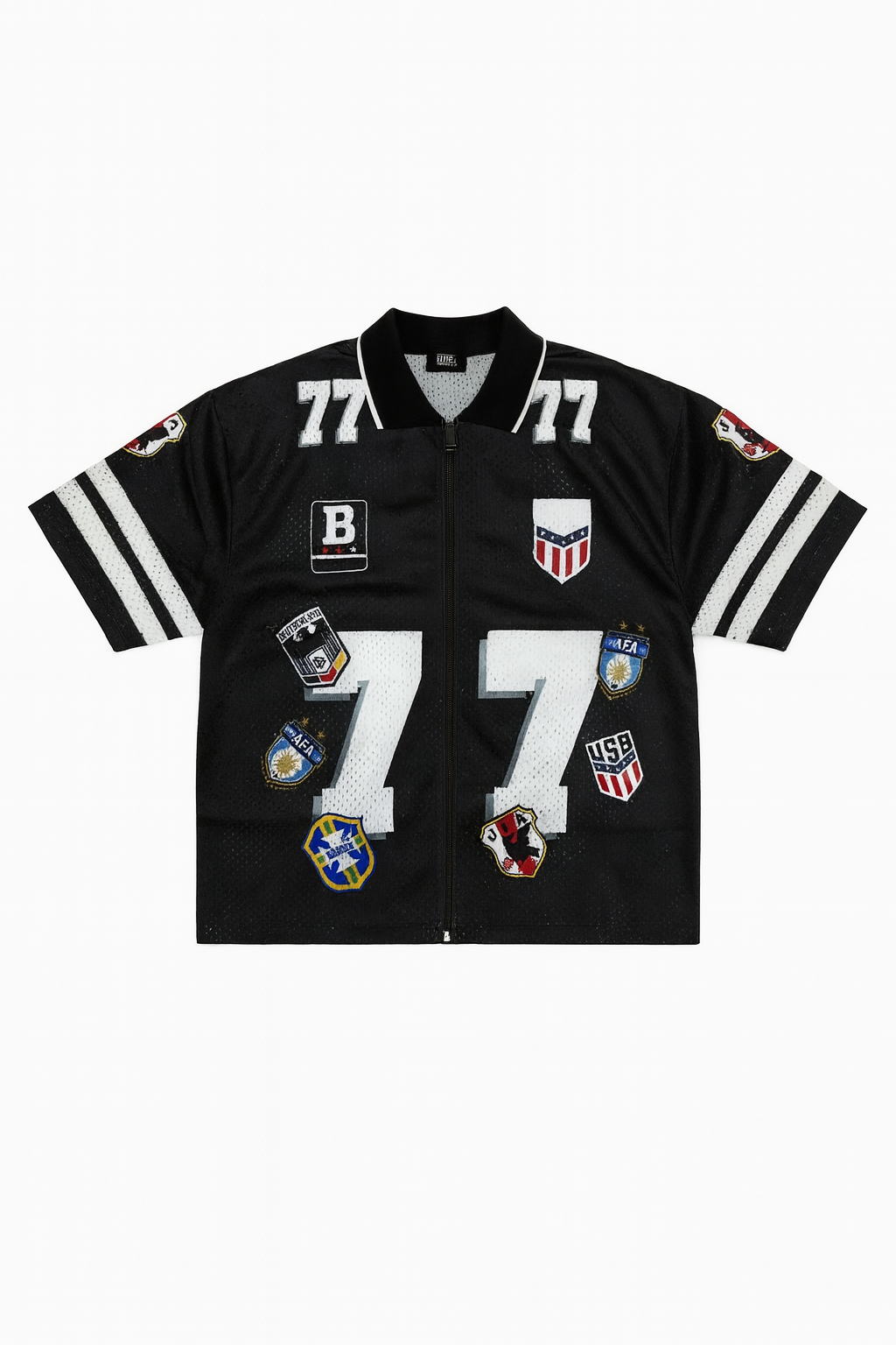 Black “77” Patchwork Zip-Up Mesh Jersey – Streetwear Edition