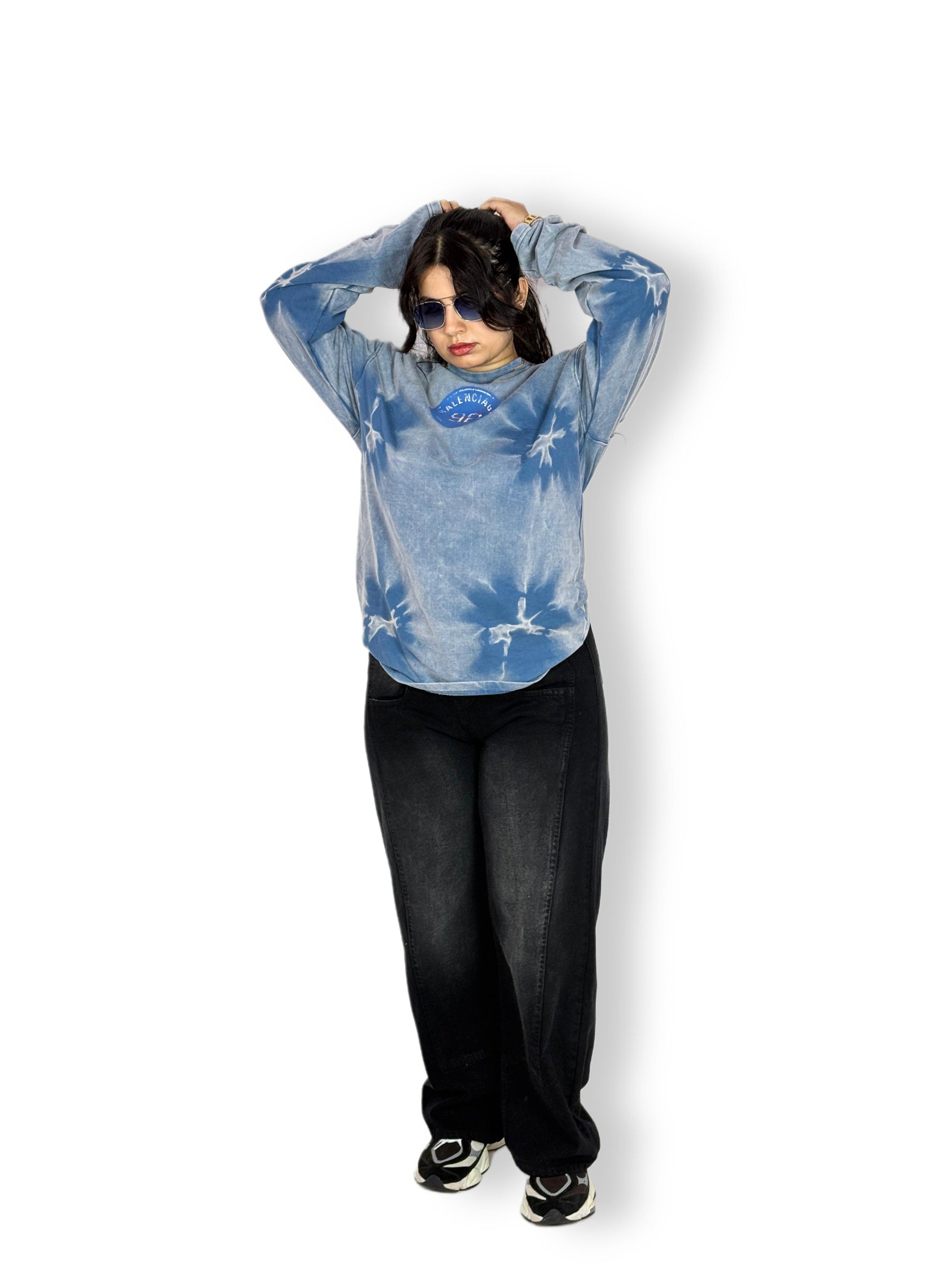 Stay stylish and cozy in this Blue Tie-Dye Full Sleeve Sweatshirt, designed with a trendy washed tie-dye effect and a subtle chest print detail. Its relaxed oversized fit makes it perfect for everyday wear, whether you’re lounging at home or stepping out for a casual outing. Soft, breathable, and effortlessly cool, this sweatshirt is a must-have for your streetwear collection.