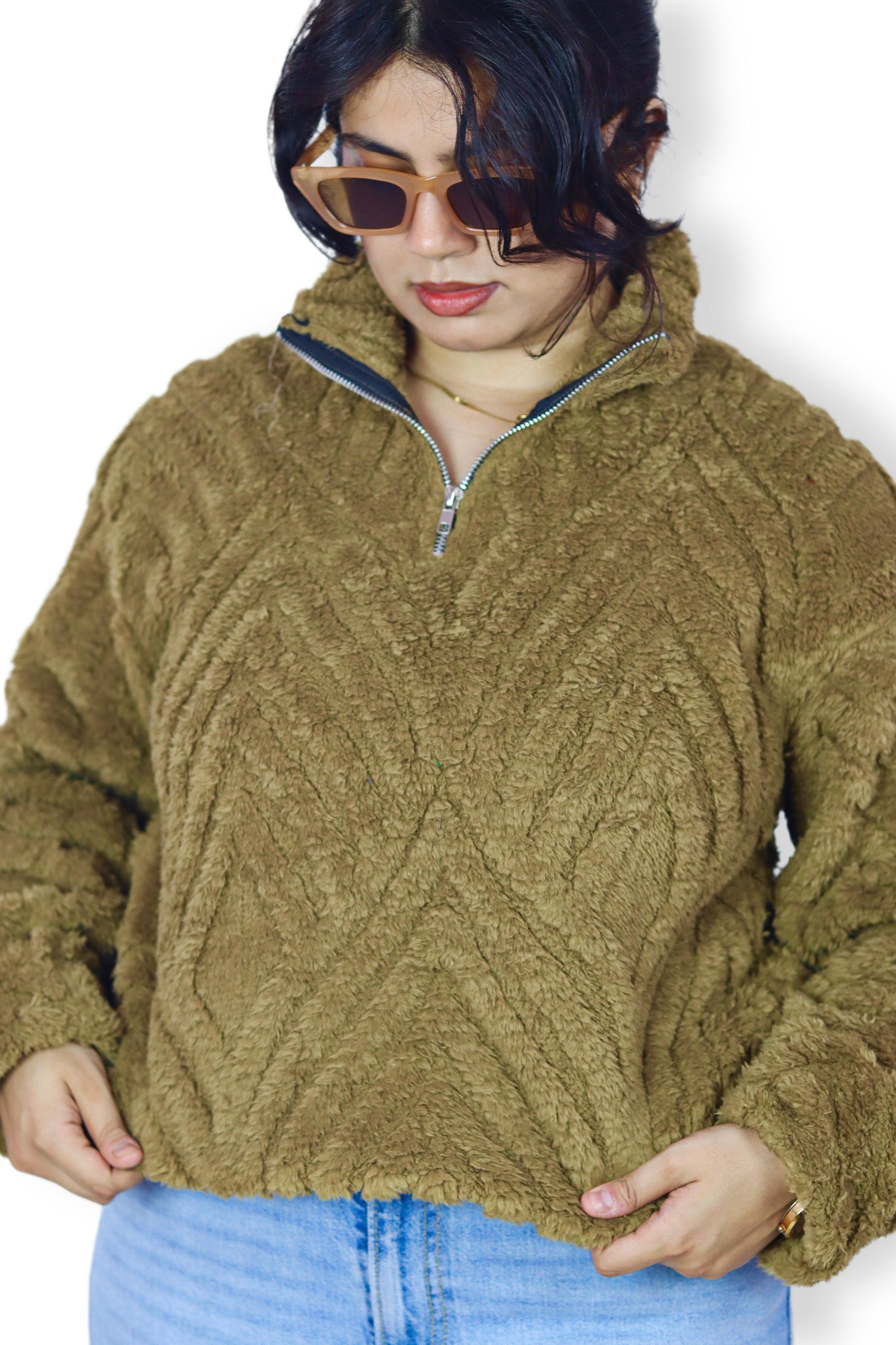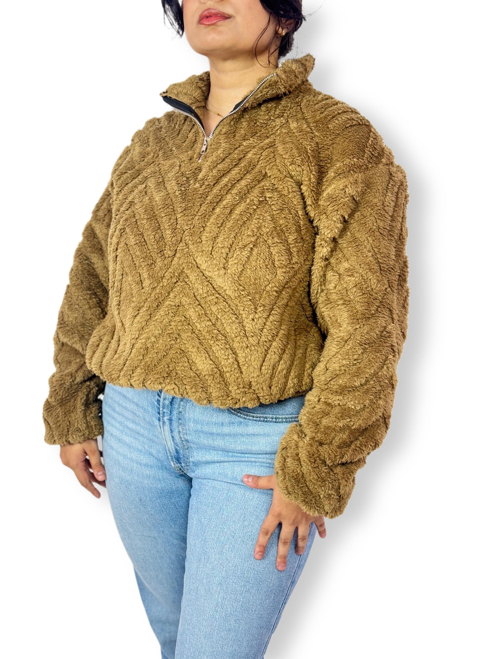 Brown Textured Sherpa Fleece Half-Zip Sweatshirt – Winter Pullover