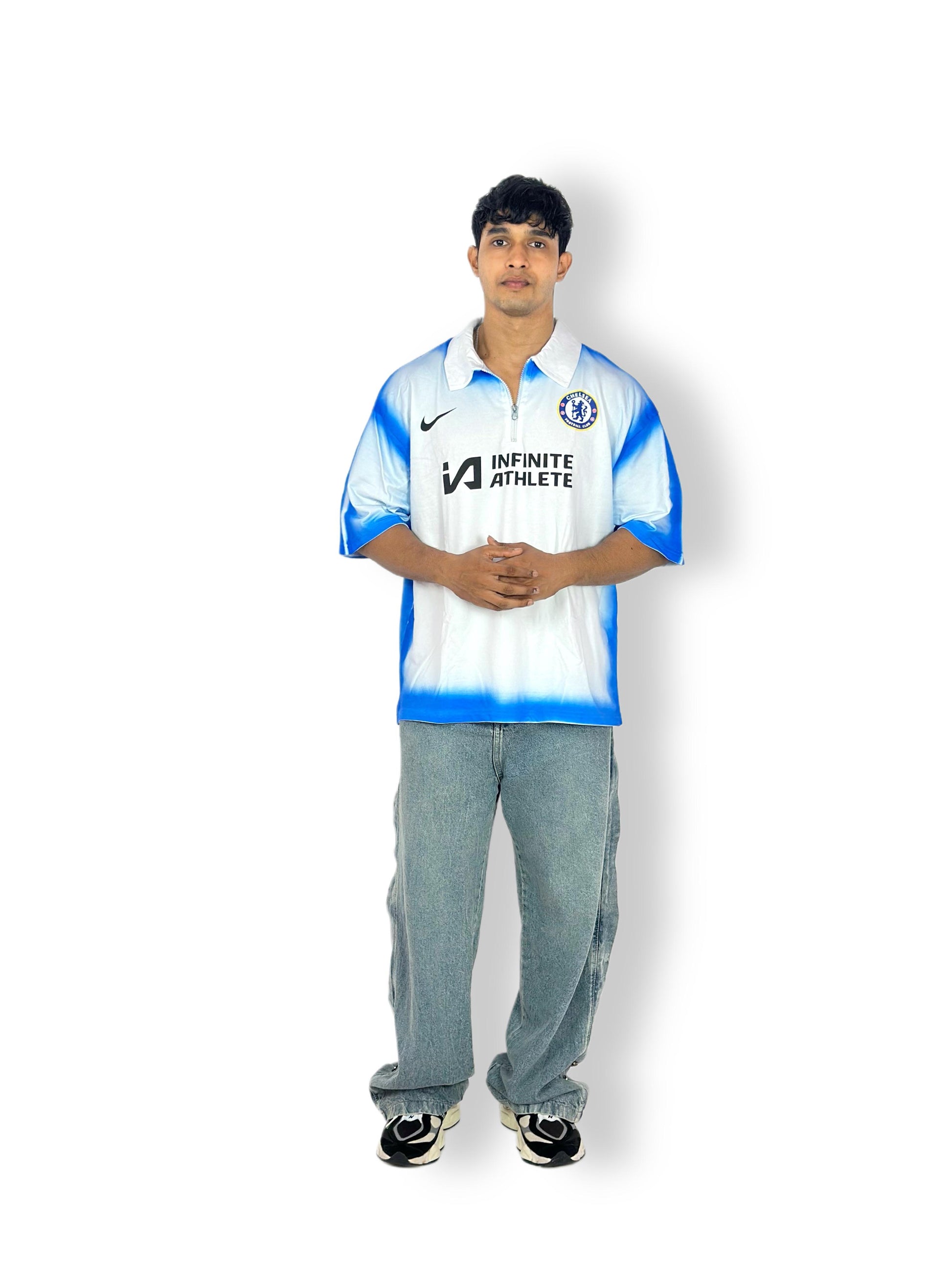 Represent the Blues in style with the Chelsea FC Away Training Half-Zip Jersey in a striking white-to-blue gradient design. Featuring the official Chelsea crest, Nike swoosh, and Infinite Athlete sponsor branding, this jersey blends authentic club pride with modern streetwear appeal. The half-zip collar offers versatility, while the lightweight, breathable fabric ensures comfort whether you’re training, traveling, or cheering from the stands.